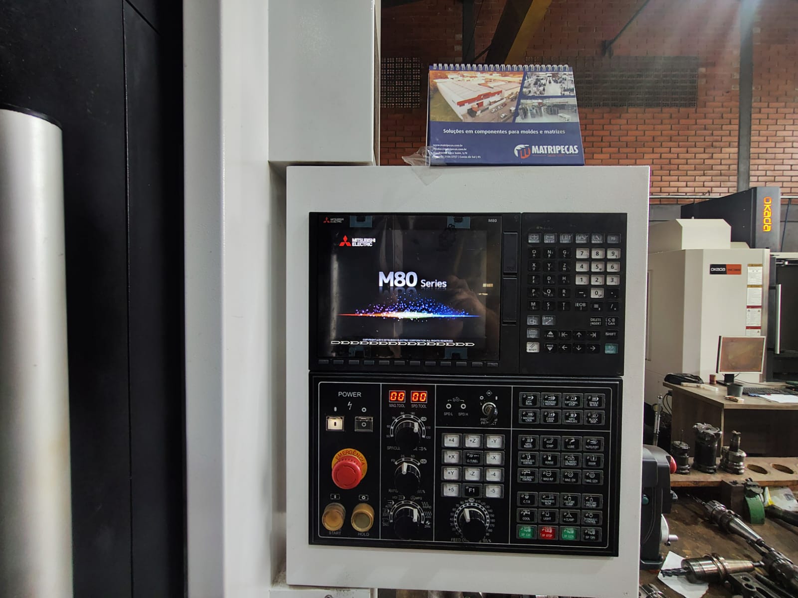 Centro de usinagem CNC vertical, marca Okada, modelo OKM 1470S, ano 2025, seminovo, equipado com comando Mitsubishi M80A, alta rotação e excelente capacidade de carga, ideal para aplicações industriais de alta produtividade. Equipamento pertencente à linha de máquinas operatrizes para usinagem de precisão.